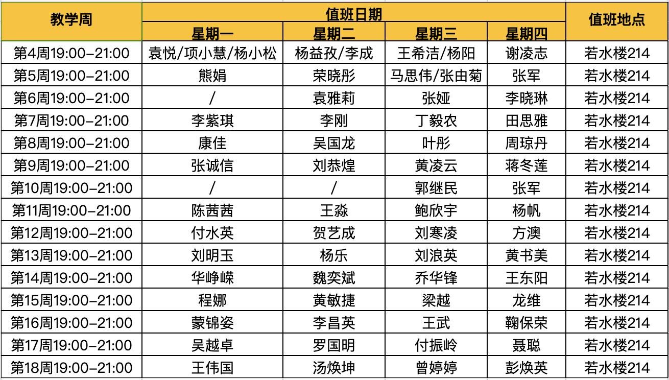 如同学们有马院课程、考研、就业等方面的相关疑问,欢迎在值班时间内到对应值班地点进行咨询。具体的值班安排如下: