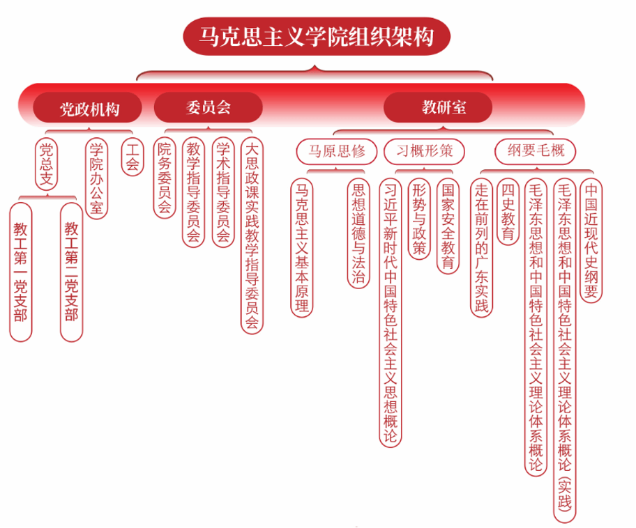 学院共设三个大教研室,分别为毛概史纲教研室、马原道法教研室、习概形策教研室,另设有思想政治理论课教学指导委员会、学术委员会、大思政课实践教学指导委员会、池田大作研究中心、大思政课实践教学研究中心。